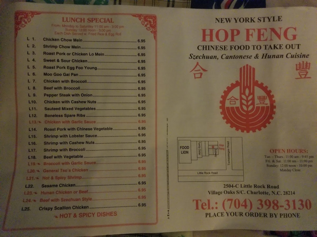 The menu at Hop Feng Kitchen reflects a straightforward, casual approach to Chinese dining, offering comforting favorites that suit a quick lunch or an easy dinner at home. This is a place where familiar dishes like Sesame Chicken, Orange Chicken, and Lo Mein come together with hearty options like Beef and Broccoli served with yellow rice or House Fried Rice with shrimp. The selection feels approachable and satisfying, perfect for those moments when you want flavorful, uncomplicated food without fuss.